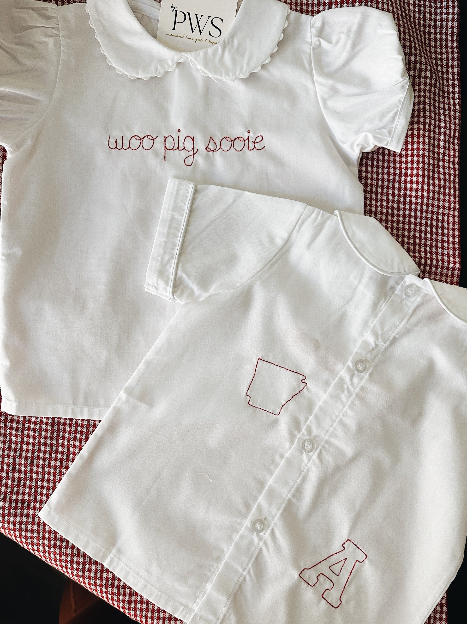 The Arkansas Woven Scalloped Collared shirt features the iconic phrase “woo pig sooie” on the front. On the back, there is an Arkansas state outline and an “A” for Arkansas. Featuring a sweet scalloped Peter Pan collar and puffed short sleeves, it’s the perfect blend of timeless style and everyday comfort. Pairs well with a pair on red bloomers, shorts, pants for cheering on the hogs!