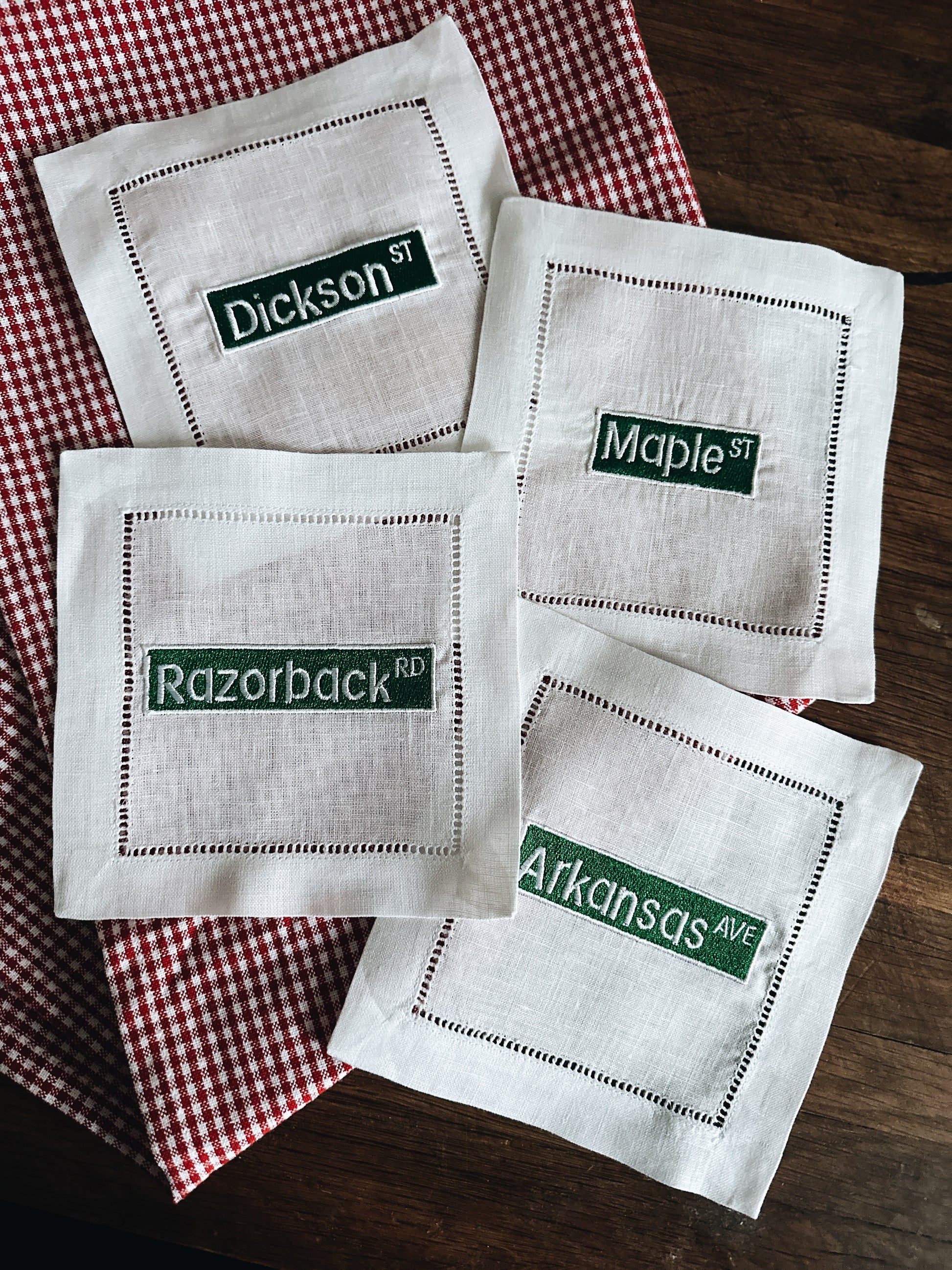 Relive your favorite memories (or make new ones!) with the Fayetteville Street Signs Linen Cocktail Napkins! As an Arkansas graduate, I can think of many memories made on these streets and I am sure you can think of a few too!