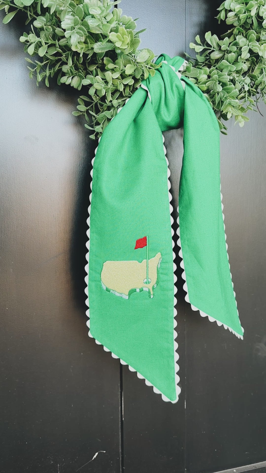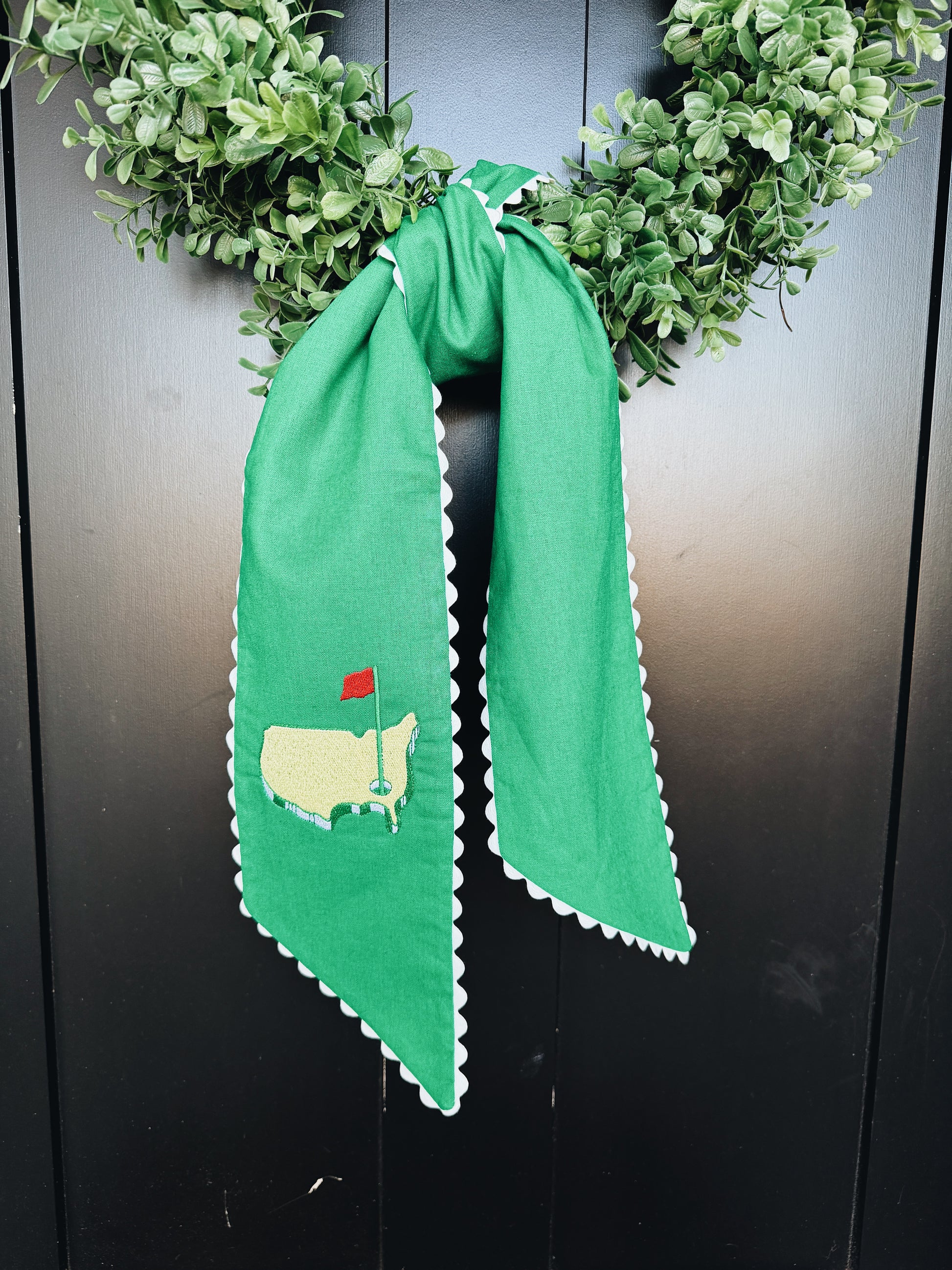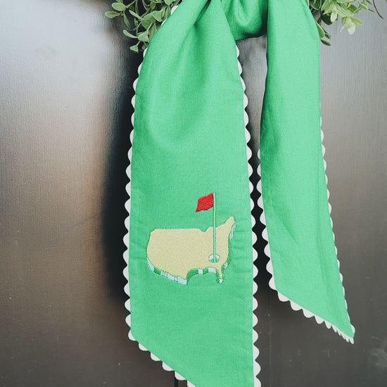 The USA Golf Kelly Green Wreath Sash with Ivory Ric Rac is perfect for your Masters watch party! Personalize with your family’s initial or monogram. Thread will be yellow.